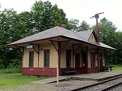 The former Ashland Railroad Station is located south of the commercial center of the village of Ashland, on the south side of Depot Street at its junction with Winter Street. Depot Street, running roughly east–west, is crossed by a single-track railroad line on a diagonal from northwest to southeast. The station is located on the northeast side of the track, its long side oriented in parallel to the track. It is a single-story wooden structure, with post-and-beam framing, which is covered by a hipped slate roof. The roof has wide overhangs visually supported by knee braces. The station is basically rectangular, with projecting elements on the long sides near the center. The track side projection houses the station agent's ticket office, while that on the other side houses restrooms.[2]