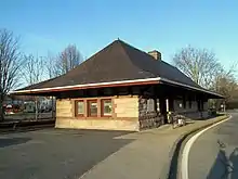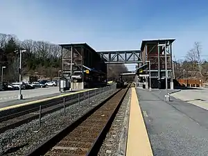 In 1994, service to Worcester was restored as mitigation for delays with reopening the Old Colony Lines. Service initially ran nonstop from Framingham to Worcester, but intermediate park and ride stops were added later as mitigation for delays in reopening the Greenbush Line. After the opening of Grafton in 2000 caused traffic congestion in the town, officials from Ashland, Southborough, and Westborough asked that their three stations open within a 90-day span to avoid overwhelming any one town with traffic. The three stations, which together cost $14.2 million, were originally scheduled to open on December 31, 2001.[5] However, they were delayed by several factors, including a debate on whether to build full-length high-level platforms. Those were ruled out because they interfere with freight traffic; instead, smaller "mini-high" platforms plus long low platforms were built.[6] Southborough and Westborough opened on June 22, 2002, followed by Ashland on August 24.[7][1] Construction of the station cost $7.4 million.[8] The new station was built to the west of the town center, where land was available for large parking lots. The downtown station still stands, and is currently used as a doctor's office.[9]