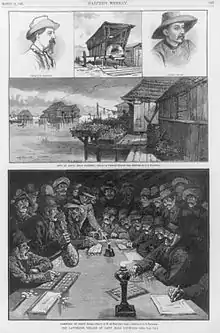 The first major wave of Asian immigration to the continental United States occurred primarily on the West Coast during the California Gold Rush, starting in the 1850s. Whereas, Chinese immigrants numbered less than 400 in 1848 and 25,000 by 1852.[14] Most Chinese immigrants in California, which they called Gam Saan ("Gold Mountain"), were also from the Guangdong province; they sought opportunity in the young United States, and hoped to earn wealth to send back to their families in China.[15] Asian immigrants were sought not only in California but across the US (including as far as North Adams, Massachusetts[16]), to fill the high demand for cheap labor in mines, factories, and on the Transcontinental Railroad. Some plantation owners in the South sought Chinese labor as a cheap means to replace the free labor of slavery.[17] Chinese laborers generally arrived in California with the help of brokers in Hong Kong and other ports under the credit-ticket system, where they would pay back money loaned from brokers with their wages upon arrival.[18] In addition to laborers, merchants also migrated from China, opening businesses and stores, including those that would form the beginnings of China towns.[19]