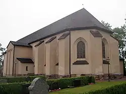 Askeby Church (Swedish: Askeby kyrka) was built together with a nunnery during the second half of the 12th century and was used until about 1530 by both the parish and the abbey. The sacristy was probably built in the late 15th or early 16th century. In 1609 the church burned down and the tower was almost completely destroyed. Only two floors of the original tower remain. The western part of the nave under went major rebuilding 1876-1877. The tower rooms regained their medieval character in 1913. In 1951, the interior was restored, the exterior in 1970. Today the church serves the parish of Askeby in the Diocese of Linköping. During 1955, a memorial stone was erected on site to the memory of Askeby Abbey.[4]