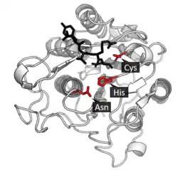 Legumain is a cysteine protease from the C13 family of the CD clan of proteases (MEROPS).[11] It uses a catalytic triad of Cysteine-Histidine-Asparagine in its active site to perform covalent proteolysis of its substrate.[3]