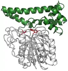 Human pro-legumain with catalytic triad in red, bound to its auto-inhibitory C-terminal prodomain in green. (PDB: 4FGU) | |||||||||