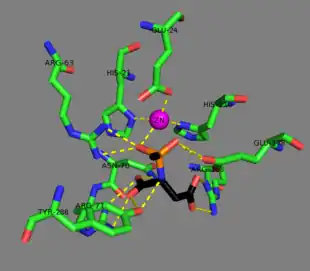 The zinc cofactor is found at the active site and is held by Glu-24, His-21, and His 116.[13] The substrate is held in place by Arg-63, Asn-70, Arg-71, Tyr-164, Arg-168, and Tyr-288.[5] The zinc cofactor is used to lower the pKa of a ligated water molecule so that an attack on N-acetyl-L-aspartate may occur and to stabilize the resulting tetrahedral intermediate along with Arg-63, and Glu-178.[13]