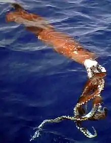 | A specimen of A. acanthoderma found floating at the surface off Little Cayman in May 2008. The squid measured over 7 feet (2.1 m) in length.[1] | |