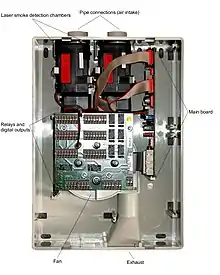 An aspirating smoke detector (ASD) is a system used in active fire protection, consisting of a central detection unit which draws air through a network of pipes to detect smoke.[1] The sampling chamber is based on a nephelometer that detects the presence of smoke particles suspended in air by detecting the light scattered by them in the chamber. ASDs can typically detect smoke before it is visible to the naked eye.
