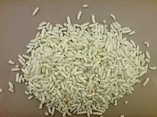 Chira (Flattened rice, also called beaten rice, Assamese: চিৰা) is a dehusked rice which is flattened into flat light dry flakes. These flakes of rice swell when added to liquid, whether hot or cold, as they absorb water, milk or any other liquids. It can be eaten raw by immersing it in plain water or milk or curd, with salt or sugar or jaggery to taste, or lightly fried in oil.