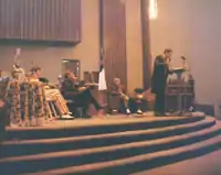 During the time when African Americans were barred from ordination, women began to receive greater opportunities for leadership. Women formed an important part of the Assemblies of God's constituency, many being Sunday School workers and evangelists, most prominent being Aimee Semple McPherson (who would later found the Foursquare Church). This made the issue of women's place in the movement important in the 1930s.[47] It was also recognized that many congregations who could not afford male pastors relied on women preachers. Although opposition to female pastors had been regularly affirmed since 1914, the office of pastor was opened to women in 1935.[48]