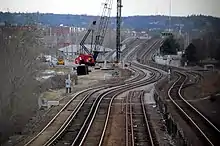 For construction, the MBTA shifted outbound trains to the normally unused express track and inbound trains to the outbound track, to give construction crews full access to the site.[15] In January 2013, the MBTA began constructing concrete pillars to support the platform and headhouses; elevator shaft construction began in the spring.[15] Construction of the headhouse frames began in June 2013, and the platform segments were laid in July. The headhouses were completed in June 2014, with work remaining on other parts of the station.[16]