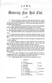 The Cambridge rules, first drawn up at the University of Cambridge in 1848, were particularly influential in the development of subsequent codes, including association football. The Cambridge rules were written at Trinity College, Cambridge, at a meeting attended by representatives from Eton, Harrow, Rugby, Winchester and Shrewsbury schools. They were not universally adopted. During the 1850s, many clubs unconnected to schools or universities were formed throughout the English-speaking world to play various forms of football. Some came up with their own distinct codes of rules, most notably the Sheffield Football Club, formed by former public school pupils in 1857,[34] which led to the formation of a Sheffield FA in 1867. In 1862, John Charles Thring of Uppingham School also devised an influential set of rules.[35]