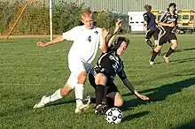 At a professional level, most matches produce only a few goals. For example, the 2005–06 season of the English Premier League produced an average of 2.48 goals per match.[91] The Laws of the Game do not specify any player positions other than goalkeeper,[92] but a number of specialised roles have evolved.[93] Broadly, these include three main categories: strikers, or forwards, whose main task is to score goals; defenders, who specialise in preventing their opponents from scoring; and midfielders, who dispossess the opposition and keep possession of the ball to pass it to the forwards on their team. Players in these positions are referred to as outfield players, to distinguish them from the goalkeeper.