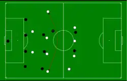 - Pass and move: Having the ball in their possession, the player needs to choose quickly whether to pass it or not. If they do not pass it immediately, they need to move with it; if they do pass it, they again need to move along, following the general ball movement. This can also be used to mean that once a player has passed the ball he does not remain stationary but moves into a position where he can receive the ball again and give more options to the player in possession. The aim is to create a forward motion by moving the ball across areas where the defence are not (easily) able to create any momentum for themselves.[10]