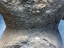 The Assyrian statue (British Museum number 124963) was originally set up near the temple of Ishtar in Nineveh (near the modern city of Mosul in northern Iraq). The statue remains the only known Assyrian statue of a naked woman.[1] The inscription shows it was intended "for titillation"[2] or "to be alluring",[3][4] and may represent an attendant of Ishtar, or Ishtar herself in her role as the goddess of love. The statue was first dated by E. A. Wallis Budge as being c.1080 BCE.[5][1]