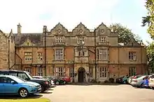 Access to the main house is via a semi-circular headed doorway with rusticated arch and an Ionic motif above a keystone.[2] Above the porch is inscribed "SLB 1912", which refers to the date of the final acquisition of the house and additions to it by Stanley and Lucy Baldwin. The porch is flanked by a transomed window and Ionic pilasters. On the interior, the entrance lobby has a Jacobean strapwork ceiling.[2]