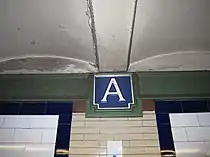 The station's renovation started in June 1984 and was completed by May 1986.[50] The scope of the project included the restoration of the platform's glazed ceramic beaver plaques; refurbishing the 1950s platform extensions with a design similar to the original station; cleaning the ceiling; and adding new lighting, noise-abatement material, and brown floor tiles.[43]: 82–83 A new piece of porcelain steel artwork by Cooper Union alumnus Milton Glaser was installed and a cast-iron copy of one of the station's original kiosks was built.[43]: 82–83 [50] The MTA rejected Glaser's original proposal to include beaver representations in the artwork because the beavers too closely resembled rats.[43]: 3 Glaser's artwork was installed as a gift, and the kiosk was installed using leftover funding.[52] An underpass between the northbound and southbound platforms was closed and covered up in the 1980s renovation.[2]: 4 Sound-deadening panels were also installed in the station.[53] Following the completion of the project, architectural writer Paul Goldberger wrote that the Astor Place station's "value as architecture lies not in any generous space it offers, but in a series of pleasing details".[54]