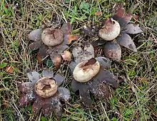 Astraeus hygrometricus, commonly known as the hygroscopic earthstar, the barometer earthstar, or the false earthstar, is a species of fungus in the family Diplocystaceae. Young specimens resemble a puffball when unopened. In maturity, the mushroom displays the characteristic earthstar shape that is a result of the outer layer of fruit body tissue splitting open in a star-like manner. The false earthstar is an ectomycorrhizal species that grows in association with various trees, especially in sandy soils. A. hygrometricus was previously thought to have a cosmopolitan distribution, though it is now thought to be restricted to Southern Europe, and Astraeus are common in temperate and tropical regions.[2] Its common names refer to the fact that it is hygroscopic (water-absorbing), and can open up its rays to expose the spore sac in response to increased humidity, and close them up again in drier conditions. The rays have an irregularly cracked surface, while the spore case is pale brown and smooth with an irregular slit or tear at the top. The gleba is white initially, but turns brown and powdery when the spores mature. The spores are reddish-brown, roughly spherical with minute warts, measuring 7.5–11 micrometers in diameter.
