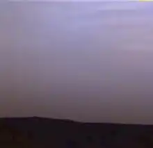 The normal hue of the sky during the daytime can vary from a pinkish-red to a yellow-brown “butterscotch” color; however, in the vicinity of the setting or rising sun it is blue. This is the exact opposite of the situation on Earth. [3] On Mars, Rayleigh scattering is usually a very small effect. It is believed that the color of the sky is caused by the presence of 1% by volume of magnetite in the dust particles. Twilight lasts a long time after the Sun has set and before it rises, because of all the dust in Mars' atmosphere. At times, the Martian sky takes on a violet color, due to scattering of light by very small water ice particles in clouds.[4]