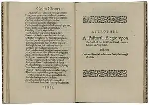 Astrophel: A Pastorall Elegy upon the Death of the Most Noble and Valorous Knight, Sir Philip Sidney is a poem by the English poet Edmund Spenser.[1] It is Spenser's tribute to the memory of Sir Philip Sidney, who had died in 1586, and was dedicated "To the most beautiful and vertuous Ladie, the Countesse of Essex", Frances Walsingham, Sidney's widow.