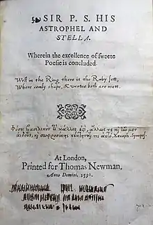 Many of the poems were circulated in manuscript form before the first edition was printed by Thomas Newman in 1591, five years after Sidney's death. This edition included ten of Sidney's songs, a preface by Thomas Nashe and verses from other poets including Thomas Campion, Samuel Daniel and the Earl of Oxford.[3] The text was allegedly copied down by a man in the employ of one of Sidney's associates, thus it was full of errors and misreadings that eventually led to Sidney's friends ensuring that the unsold copies were impounded.[4] Newman printed a second version later in the year, and though the text was more accurate it was still flawed. The version of Astrophil and Stella commonly used is found in the folio of the 1598 version of Sidney's Arcadia. Though still not completely free from error, this was prepared under the supervision of his sister the Countess of Pembroke and is considered the most authoritative text available.[3] All known versions of Astrophil and Stella have the poems in the same order, making it almost certain that Sidney determined their sequence.