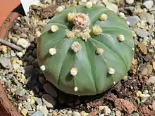 Sand Dollar Cactus has been grown as a houseplant[12] since the 1840s,[5] like other members of its genus and despite its rarity in the wild. It is readily propagated from seed,[5] so most plants encountered in nurseries are seed grown. The popularity of this species among collectors and enthusiasts has ensured that a number of cultivars are available. One such cultivar is the 'Super Kabuto', a clonally propagated variety whose large trichomes congregate into dense spots, arranged in a striking pattern.