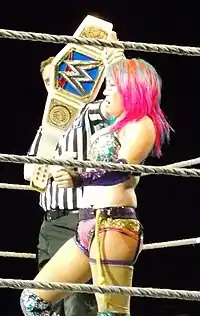 On April 17, Asuka was drafted to SmackDown as part of the 2018 WWE Superstar Shake-up, making her first appearance by saving Charlotte Flair and Becky Lynch from an attack by The IIconics (a duo made of Billie Kay and Peyton Royce) and then—SmackDown Women's Champion Carmella.[271] On the May 15 episode of SmackDown, SmackDown general manager Paige interrupted Carmella, to announce that she would be defending the SmackDown Women's Championship against Asuka at Money in the Bank.[272][273][274] At the event on June 17, Asuka lost to Carmella after an interference from the returning James Ellsworth, suffering her first official pinfall loss in WWE.[275] Paige then granted Asuka a rematch that took place on July 15 at Extreme Rules, which Asuka lost after another distraction from Ellsworth, who was hanging above the ring in a shark cage, which Carmella used to win the match.[276] In September, Asuka helped Naomi, who after defeating Peyton Royce was attacked by The IIconics.[277] This led to a tag team match between the two teams on October 6 at WWE Super Show-Down, where Asuka and Naomi were defeated.[278][279] Also during that time, it was announced that Asuka and The Miz would take part in the upcoming season two of Mixed Match Challenge.[280] They lasted until the semi-finals, where they were eliminated by eventual winners R-Truth and Carmella.[281] On November 18, Asuka took part in the Survivor Series as part of Team Smackdown, where she was the last woman eliminated from Team SmackDown.[282]