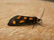 Asura cervicalis is a species of moth of the family Erebidae. It is known from the non-tropical parts of eastern Australia, including areas of New South Wales, Queensland and Victoria. The wingspan is about 15 mm (0.59 in). Adults are slim bodied and black with five yellow spots on each forewing. There is a large yellow patch on each hindwing.[2] The moths have sparse grey hairs. There are four tufts of long dense black hair projecting from the verrucae on the meso- and meta-thorax on each side. The larvae have been observed on Ficus, Acacia and Eucalyptus species. It is suspected of feeding only on the lichens on the trunks and branches of these plants. Pupation takes place in a thin cocoon of felted hairs, attached to a wall or tree trunk.