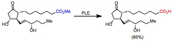 Esterase enzymes may also be used for hydrolysis of base-sensitive monoesters. PLE has been applied to the synthesis of prostaglandins for the selective hydrolysis of the ester without destruction of the β-hydroxy ketone moiety.[14]