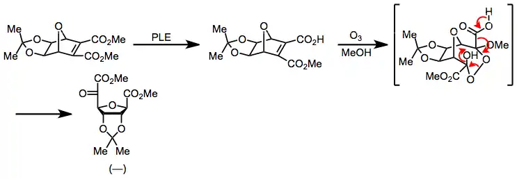 Enantioselective hydrolysis of a conjugated diester followed by ozonolysis affords the skeleton of ribose. The resulting sugars are then carried on for the synthesis of nucleosides.[15]