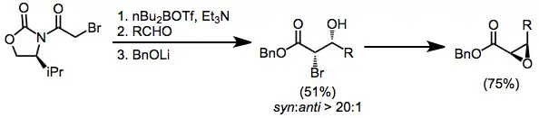 The asymmetric Darzens reaction between aldehydes and (alpha)-haloesters is an effective method for the synthesis of glycidic esters.[25] Chiral auxiliaries,[26] chiral boron enolates,[27] and asymmetric phase transfer catalysis[28] have been used successfully to effect asymmetric induction in the Darzens reaction.