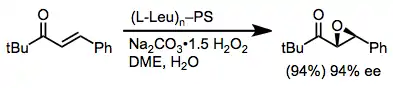 Aryl alkyl (E)-enones have been epoxidized with high enantioselectivity using stoichiometric zinc peroxide systems.[6] Polyleucine may be used with these substrates as well;[18] when an existing stereocenter in the substrate biases the sense of selectivity of the epoxidation, polyleucine is able to overcome this bias.