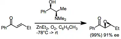 Methods that employ metal peroxides modified by chiral, non-racemic ligands operate by a similar mechanism in which the metal cation plays a templating role. Chiral zinc alkoxides under an oxygen atmosphere have been used to epoxidize some classes of enones (see equation (8) below). The evolution of ethane gas and uptake of oxygen are evidence for ligand exchange followed by oxidation of the intermediate zinc alkoxide species.[10] A catalytic version of this transformation has been achieved using chiral zinc alkylperoxides.[11]