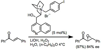 Phase-transfer catalysis of nucleophilic epoxidation is also possible using cinchona-based alkaloid catalysts. Phase-transfer methods allow some variability in the oxidant used: hydroperoxides, hydrogen peroxide, and hypochlorites have all been used with some success.[15]