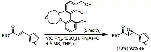 In combination with BINOL ligands and cumene hydroperoxide, lanthanide alkoxides can be used to epoxidize both trans and cis enones with high enantioselectivity. Studies of non-linear effects with these catalyst systems suggest that the active catalyst is oligomeric.[13]