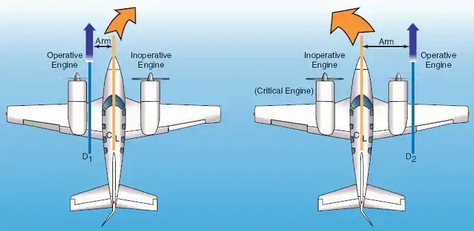When one engine fails, a yawing moment develops, which applies a rotational force to the aircraft that tends to turn it toward the wing that carries the engine that failed. A rolling moment might develop, due to the asymmetry of the lift in each wing, with a greater lift generated by the wing with the operating engine. The yawing and rolling moments apply rotational forces that tend to yaw and roll the aircraft towards the failed engine. This tendency is counteracted by the pilot's use of the flight controls, which include the rudder and ailerons. Due to P-factor, a clockwise rotating right-hand propeller on the right wing typically develops its resultant thrust vector at a greater lateral distance from the aircraft's center of gravity than the clockwise rotating left-hand propeller (Figure 1). The failure of the left-hand engine will result in a larger yawing moment by the operating right-hand engine, rather than vice versa. Since the operating right-hand engine produces a larger yawing moment, the pilot will need to use larger deflections of the flight controls or a higher speed in order to maintain control of the aircraft. Thus, the failure of the left-hand engine has a greater impact than failure of the right-hand engine, and the left-hand engine is called the critical engine. On aircraft with propellers that rotate counter-clockwise, such as the de Havilland Dove, the right engine would be the critical engine.
