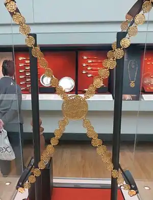 Thirty six objects have been attributed to the treasure that range in date from the third to the sixth century. Twelve pieces came to Berlin, including a large bejewelled pectoral, two elaborate necklaces and several pairs of bracelets, all the gift of Friedrich Ludwig von Gans in 1912/13.[4] Six objects were donated in 1916 to the British Museum by Mary Lyman Burns, sister of the financier J. Pierpont Morgan. They include a massive body-chain,[5] the largest piece of jewellery known from the early Byzantine period, plus a matching pair of earrings and necklace, and two spiral bracelets in the form of snake. The remainder of the treasure is held by the Metropolitan Museum, many of which were donated by Pierpont Morgan in 1917. It includes one of the most famous pieces – a plain neck ring attached to a frame, set with a large central medallion of a Byzantine emperor with the obverse showing the figure of Constantinopolis seated on a throne. Other pieces in the Met include another gold pectoral set with the semissis of Emperor Maurice Tiberius, and two matching pairs of bracelets.[6]