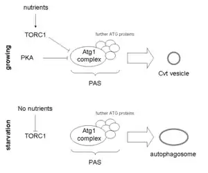 Atg1 can associate with a number of other proteins of the Atg family to form a complex that functions in autophagosome or Cvt vesicle formation. The initiation of autophagy involves the building of the pre-autophagosomal structure (PAS). Most Atg proteins accumulate at the PAS and generate either Cvt vesicles under normal growing conditions or autophagosomes under starvation.[2] To date, there are 31 ATG genes, which can be classified into several different groups according to their functions at the different steps of the pathway. 17 of these genes only work in the Cvt pathway.