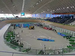 The Athens Olympic Velodrome is a velodrome stadium that is located in Marousi, Athens, Greece, at the Athens Olympic Sports Complex. The venue, which have the capacity for 5,250 persons,but only 3,300 seats were used due the security measures available for the 2004 Summer Olympic Games and the 2004 Summer Paralympics - has distinctive twin roofs, covering the stands on each side.