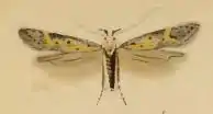 The wingspan is 9–10 mm.[3] The forewings are yellow, with the costal margin and apical areas black. The posterior margin covered with dark scales and there is a prominent dark spot near the base, two others at one-third and two-thirds and an additional small black spot at one-fourth near the costa, as well as another at two-thirds near the posterior margin. The hindwings are grey.[4]