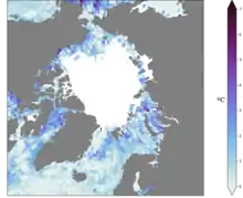 However observations show a regime shift from winter sea ice cover to open water in the southern Barents Sea in response to the warming of the inflowing Atlantic water.[9] Observations also reveal the increasing influence of Atlantic water heat further to the east, in the eastern Eurasian Basin, where in recent years the heat flux from the Atlantic water towards the surface has overtaken the atmospheric contribution in this region.[12] Furthermore, an observed weakening of the halocline over this period coincided increasing wind driven upper ocean currents, pointing to increased mixing.[13]