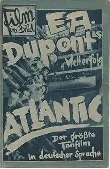 Atlantik is a 1929 British-made German language drama film directed by Ewald André Dupont and starring Fritz Kortner, Elsa Wagner and Heinrich Schroth. The film is a German language version of the 1929 film Atlantic made at Elstree Studios by British International Pictures.[1] Following the introduction of sound films, leading film companies attempted to cater to different markets by producing multiple-language versions of their films. Atlantic was released in four versions: English, French, German and silent, for cinemas not yet converted to the new format. The film was the first fully talking film to be released in Germany, where it was a major hit. It is based on the 1929 play The Berg by Ernest Raymond which itself was based on the Titanic disaster.