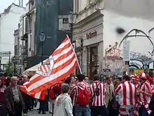 The first official club crest was a blue circle surrounded by a belt with the letters A and C in the centre in white (as the club colours were at that point).[53] The second was from 1910, consisting of a red-and-white flag (newly adopted as the shirt colours) with a red square in the top left corner, containing the initials of the club in white. The third, from 1913, involved the same flag, but in this case shown on a pole wrapped around a football (this is very similar to the Real Sociedad crest still in use today, ignoring the crown of royal patronage).[53]