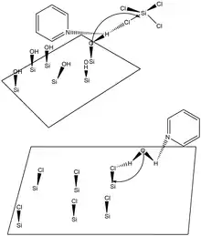 The use of catalysts is of paramount importance in delivering reliable methods of SiO2 ALD. Without catalysts, surface reactions leading to the formation of SiO2 are generally very slow and only occur at exceptionally high temperatures. Typical catalysts for SiO2 ALD include Lewis bases such as NH3 or pyridine and SiO2; ALD can also be initiated when these Lewis bases are coupled with other silicon precursors such as tetraethoxysilane (TEOS).[24] Hydrogen bonding is believed to occur between the Lewis base and the SiOH* surface species or between the H2O based reactant and the Lewis base. Oxygen becomes a stronger nucleophile when the Lewis base hydrogen bonds with the SiOH* surface species because the SiO-H bond is effectively weakened. As such, the electropositive Si atom in the SiCl4 reactant is more susceptible to nucleophilic attack. Similarly, hydrogen bonding between a Lewis base and an H2O reactant make the electronegative O in H2O a strong nucleophile that is able to attack the Si in an existing SiCl* surface species.[40] The use of a Lewis base catalyst is more or less a requirement for SiO2 ALD, as without a Lewis base catalyst, reaction temperatures must exceed 325 °C and pressures must exceed 103 torr. Generally, the most favorable temperature to perform SiO2 ALD is at 32 °C and a common deposition rate is 1.35 angstroms per binary reaction sequence. Two surface reactions for SiO2 ALD, an overall reaction, and a schematic illustrating Lewis base catalysis in SiO2 ALD are provided below.
