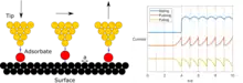Depending on the tip apex and the surface/adsorbate system, the lateral motion can occur by pushing, pulling or sliding of the adsorbate. These modes result in distinct tunneling current signals during the lateral motion. For example, periodic steps in the tunneling current indicate that the adsorbate is “jumping” between adsorption sites while following the tip: this means the tip pushes or pulls the adsorbate.