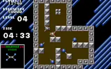 Atomix takes place on a playfield consisting of a number of walls, with the atoms scattered throughout. The player is tasked with assembling a molecule from the atoms. The atoms must be arranged to exactly match the molecule displayed on the left side of the screen.[2][3][4] The player can choose an atom and move it in any of the four cardinal directions. A moved atom keeps sliding in one direction until it hits a wall or another atom.[2][3][4] Solving the puzzles requires strategic planning in moving the atoms, and on later levels with little free space, even finding room for the completed molecule can be a problem. Once the molecule is assembled, the player is given a score; the faster the puzzle was completed, the higher the score.[2]
