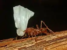 The ants cut leaves and grow a basidiomycete fungus called Leucoagaricus gongylophorus (Agaricaceae) with them.[3] Oleic acid is one of their undertaking triggers.[4]