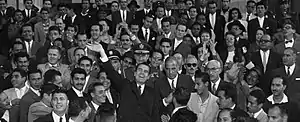 Two different accounts explain how Nixon's car was ultimately able to escape the mob and continue to the embassy. According to one version of events, the U.S. press corps' flatbed truck, accompanying the motorcade, was used to clear a path through the crowd.[20] In Nixon's remembrance of the incident, Associated Press photographer Hank Griffin at one point had to use his camera to beat back a protester who tried to mount the truck.[4] According to a second account, soldiers of the Venezuelan Army arrived and cleared the traffic, thereafter moving the mob back at bayonet-point to allow Nixon's car to pass.[25] Life wrote that the police opened a route for the car. The incident was over, 12 minutes after it began.[21]