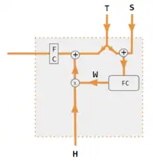 | S, T | S, decoder hidden state; T, target word embedding. In the Pytorch Tutorial variant training phase, T alternates between 2 sources depending on the level of teacher forcing used. T could be the embedding of the network's output word; i.e. embedding(argmax(FC output)). Alternatively with teacher forcing, T could be the embedding of the known correct word which can occur with a constant forcing probability, say 1/2. |