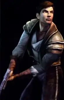 As part of his back story, Atton was once an airman in service of the Republic army, who grew to despise the Jedi Order and came to see them as hypocritical cowards who swear fealty to the Republic but fail to step up when they are needed.[12] He later joined Revan's cause, and underwent intensive training to become a deadly hunter of Jedi.[12] When recounting his experience of being an assassin for the Sith, Atton claims there is no functional difference between the opposing factions as the average person does not care about what side of the Force someone is on, though he is haunted by his internalized guilt of murdering Jedi and considers himself to be beyond forgiveness.[13] If the player accumulates enough influence with Atton, he develops a genuine respect for the Exile and chooses to follow them of his own volition, even allowing himself to be trained as an apprenticed Force user.[9] Atton may also develop feelings for a female player character, though there is no fully fledged romance in the original release.[9]