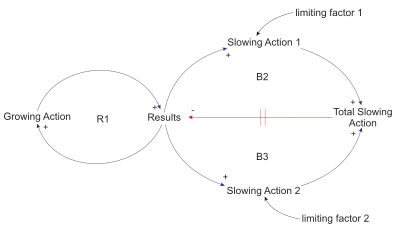 The Reinforcing Loop (R1 in Figure 1 and 2) represents accelerating growth – a growing action is producing results. This is a positive feedback loop – the more the growing action taken, the higher the results level, and yet the result itself produces even more of growing action. Balancing loops (B2 and B3 in Figure 1 and 2) represent the way the system turns back to its original state. Result produced in the reinforcing loop is influenced within the balancing loop. There are (at least) two limits causing the slowing actions in the system and adding to them. Limiting actions start to influence the system at various levels of results, generally. Since that moment slowing actions act in the system simultaneously. Both the slowing actions contribute to the total slowing action. Total slowing action then inhibits the results (this process is delayed in time). If we get back to the reinforcing loop then we can see the inhibited results are reducing growing action which is leading to the reduced results again.