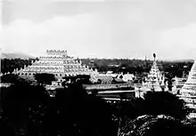 It was built in 1857 by King Mindon, two years after the capital was moved to Mandalay.[1] The monastery was built at a cost of 500,000 rupees.[2] The original monastery structure was built using teak, covered with stucco on the outside, with its peculiar feature being that it was surmounted by five graduated rectangular terraces instead of the traditional pyatthats, Burmese-style tiered and spired roofs.[2]
