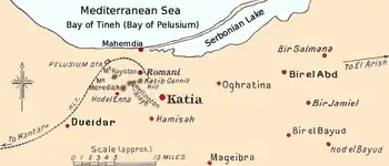 At the end of July, the 3rd Squadron was sent to patrol twenty miles (32 km) to the south near the Nagid well, observing the left flank of a Turkish force crossing the Sinai.[38][nb 2] On 1 August patrols from the 11th Squadron were sent east of Dueidar, to the En Nuss and Nagid wells, as a defence force and to expand the wells to support a brigade. On 3 August the rest of the regiment moved to Dueidar. At that time, a Turkish force occupied Mount Royston at Romani. As a result, the regiment was ordered to rejoin the brigade, and by 11:30 they were observing around 2,000 Turkish troops on Mount Royston.[40][41] For the next thirty minutes the regiment was bombed by Turkish artillery, when a brigade attack was ordered. The 3rd Squadron, supported by Lewis guns from the machine-gun sections, was positioned in the centre of the line between the Canterbury Mounted Rifles and a British yeomanry regiment. The advance forced the Turkish outposts to withdraw. By 16:45, using the cover available, the regiment drew close enough to charge the Turkish defences, capturing 250 prisoners and a field hospital. All together the brigade took 1,000 prisoners and a mountain artillery battery.[42] The regiment's casualties were two dead and six wounded.[29]
